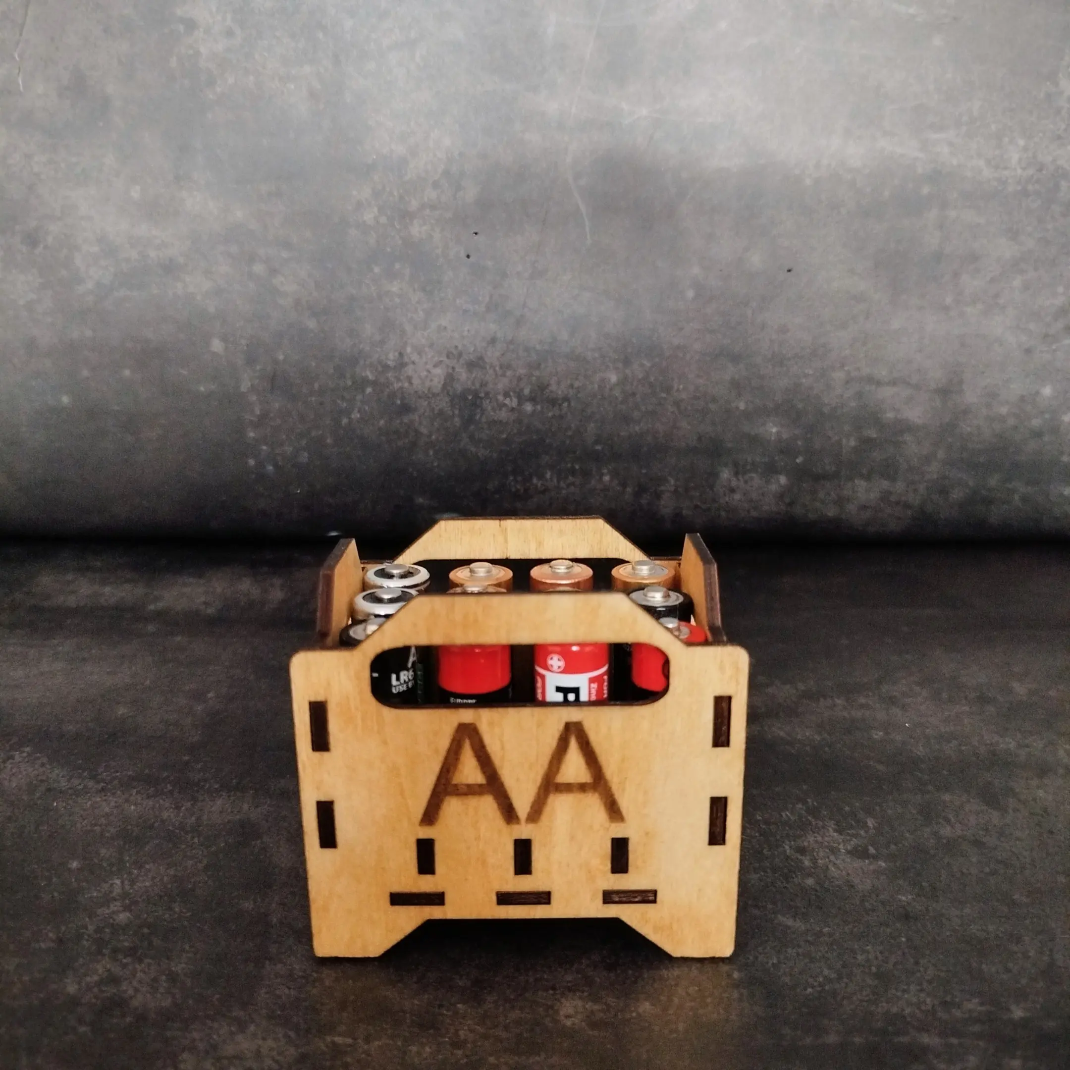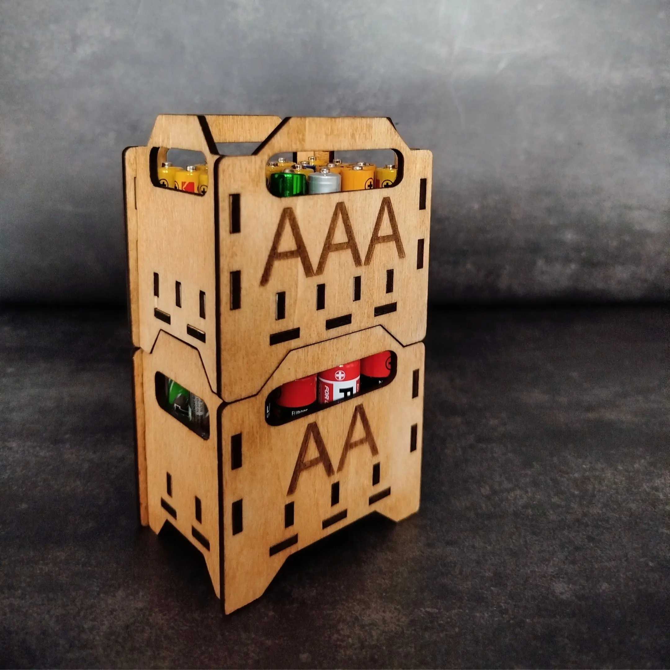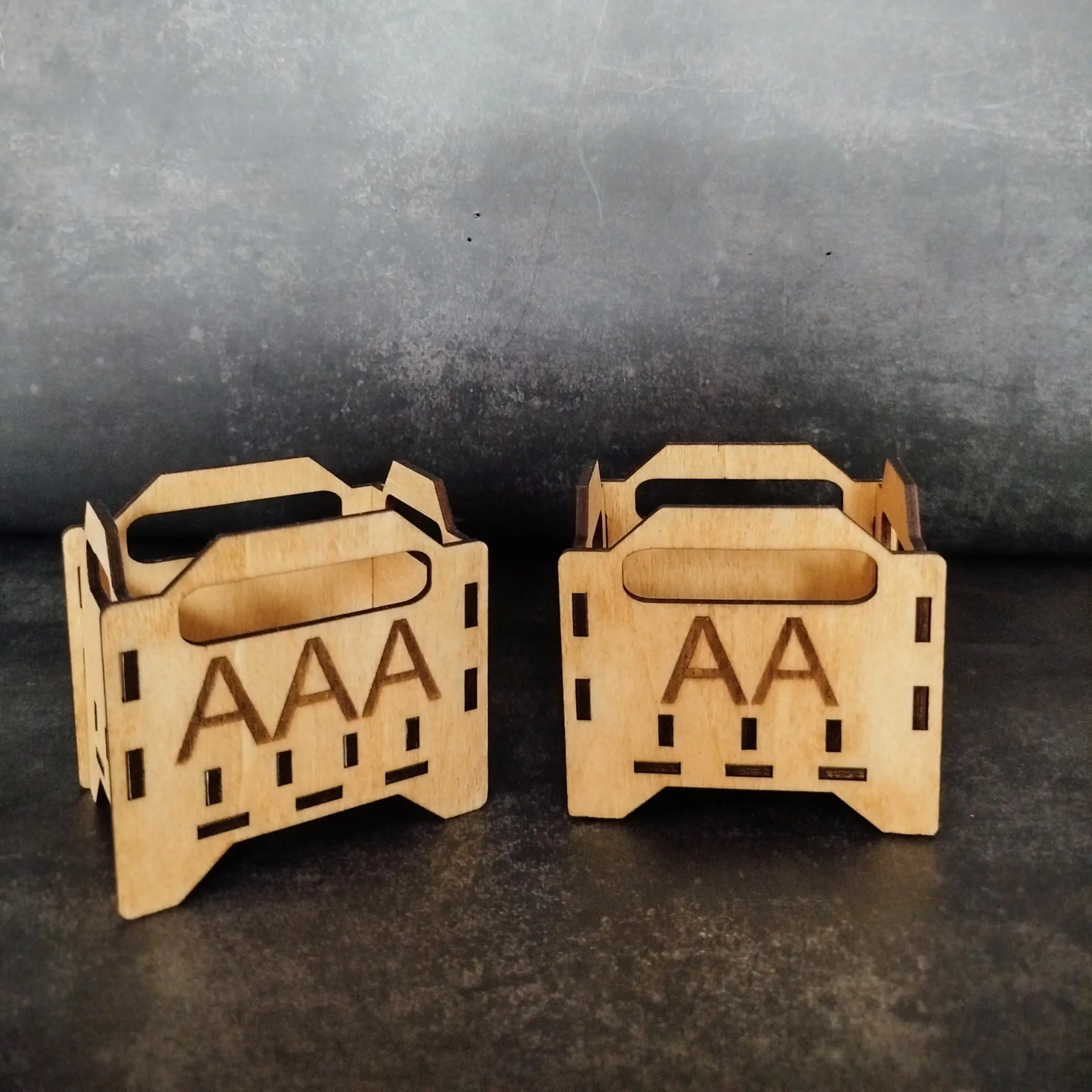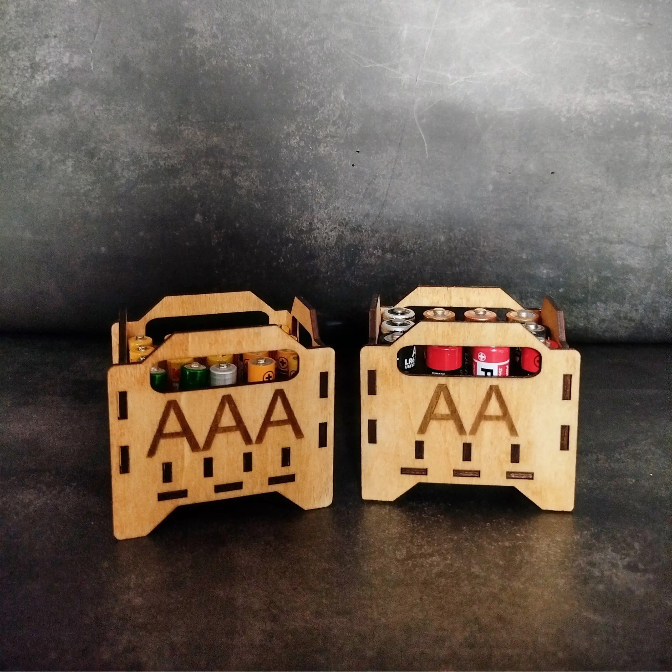 Laser Cut Battery Crate designed for organizing and storing AA and AAA batteries. The AA box holds up to 12 batteries, while the AAA box stores up to 20. These stackable wooden crates are perfect for keeping your batteries neat and accessible, whether placed on a desk, shelf, or inside a drawer. Made from durable laser-cut wood, they provide both functionality and a stylish storage solution for your home or workshop.