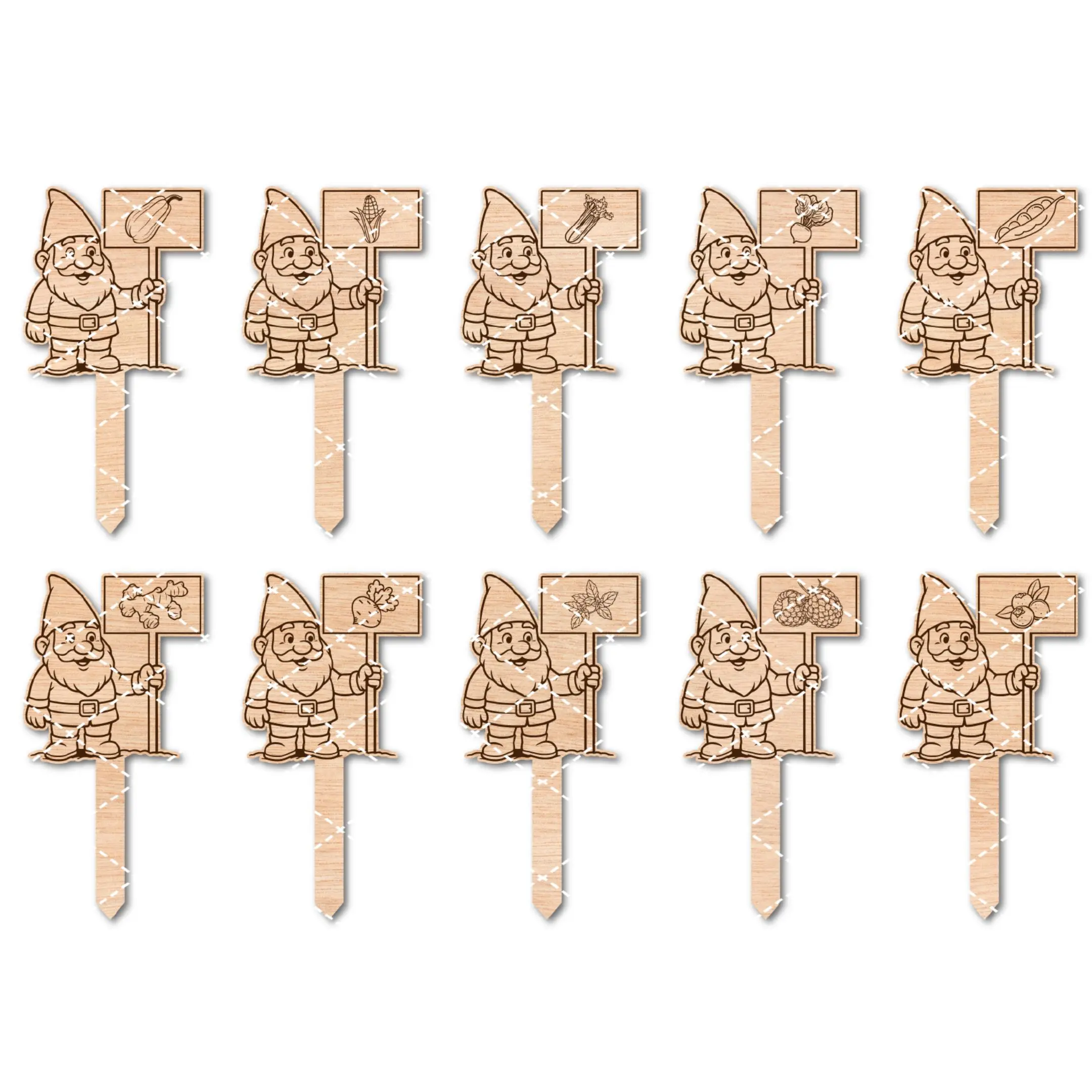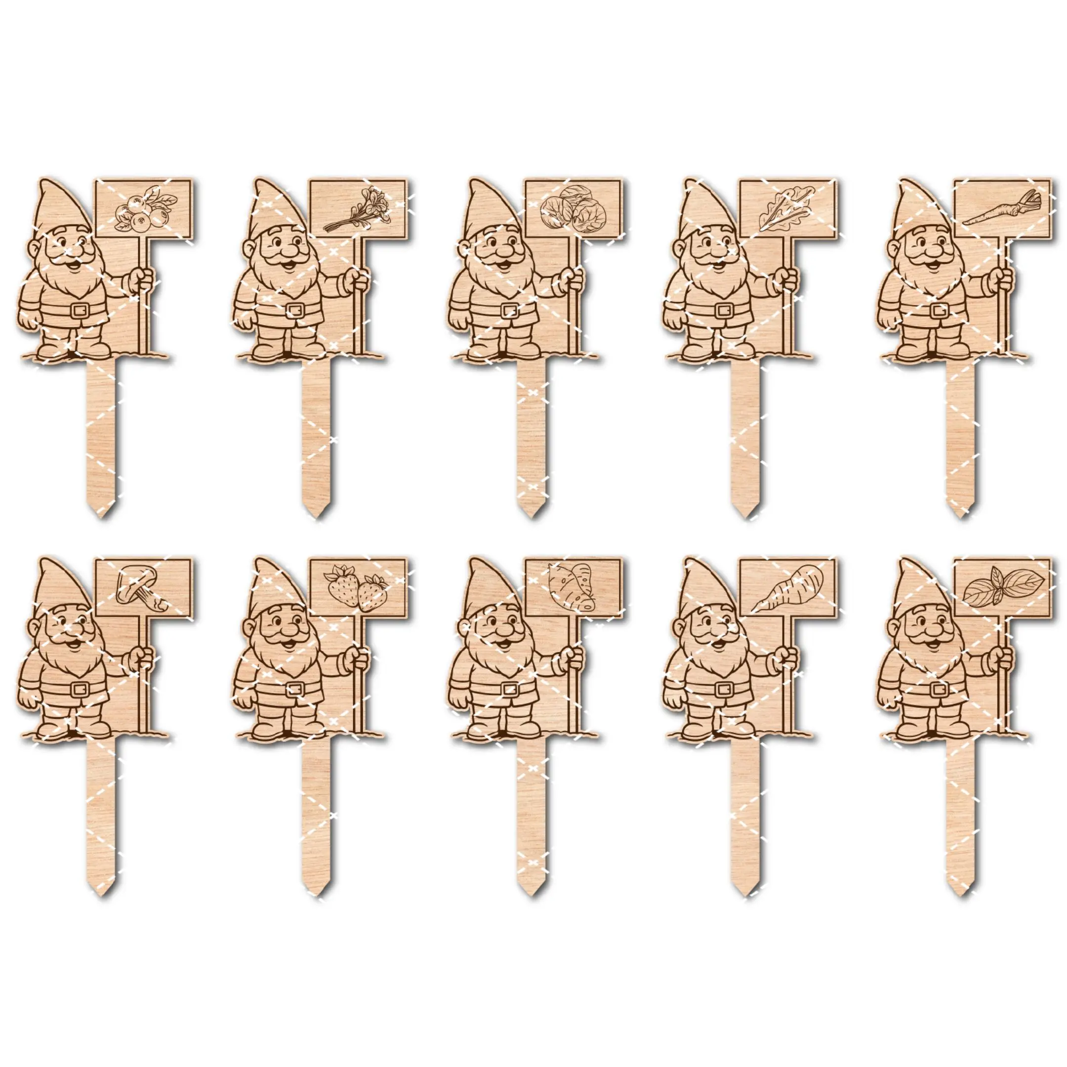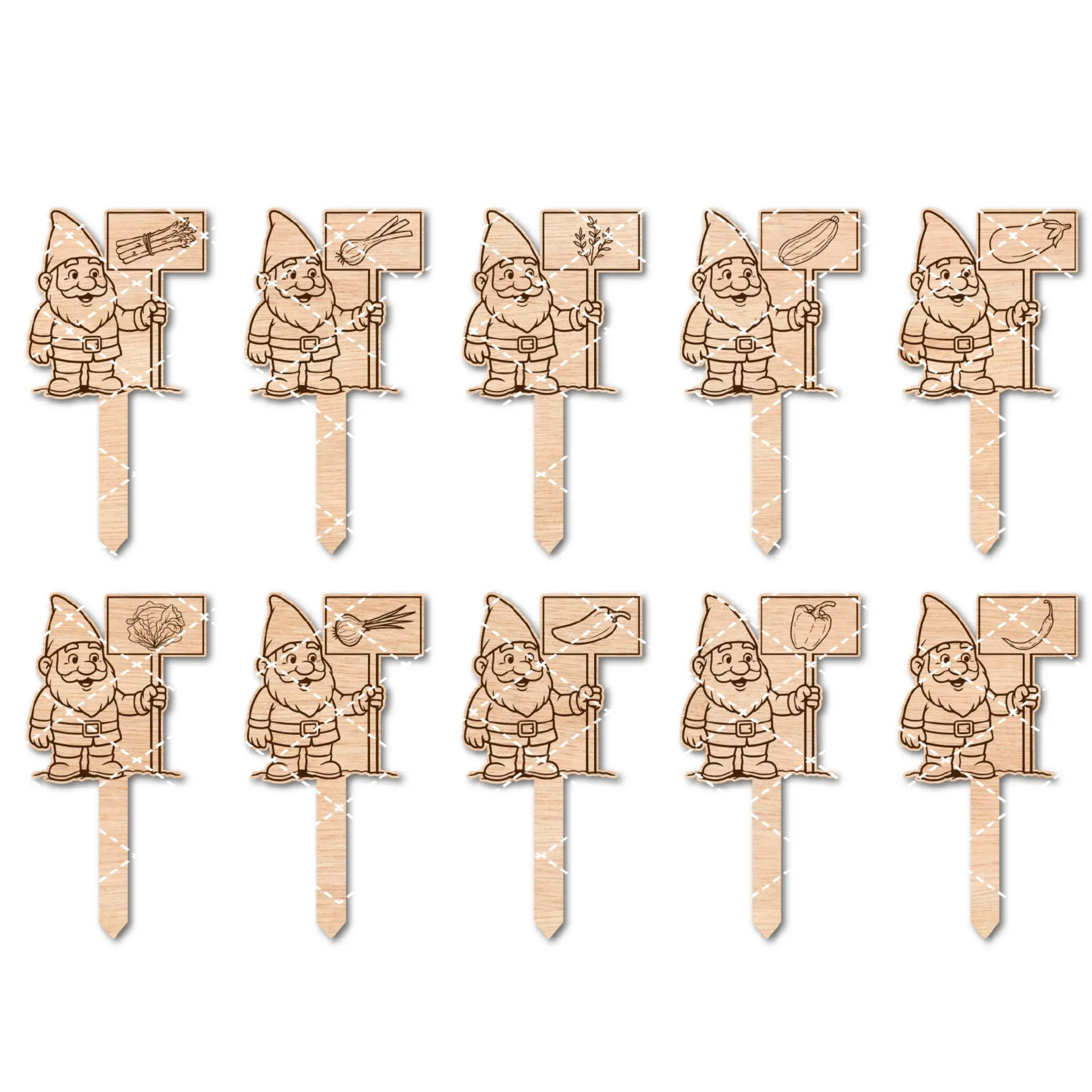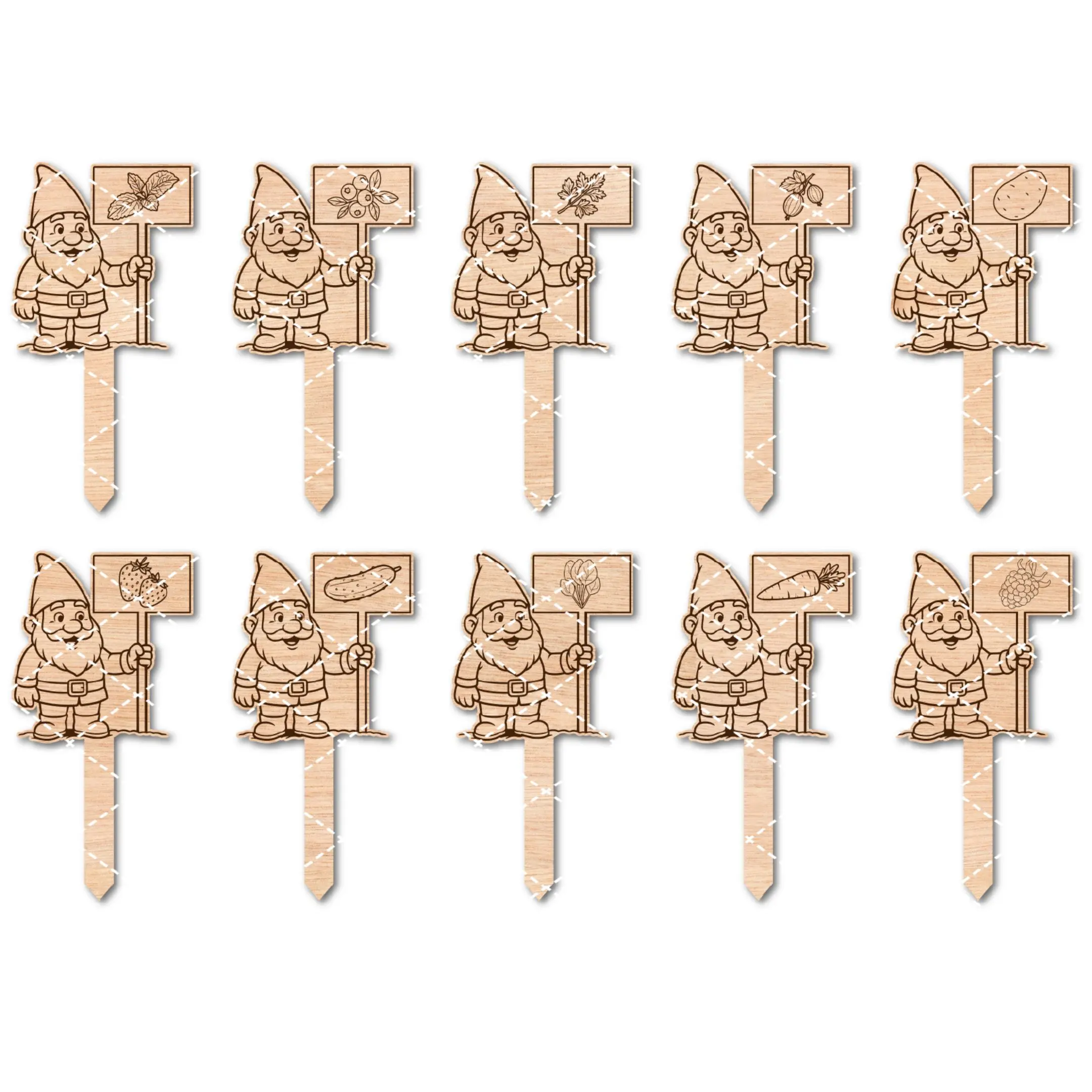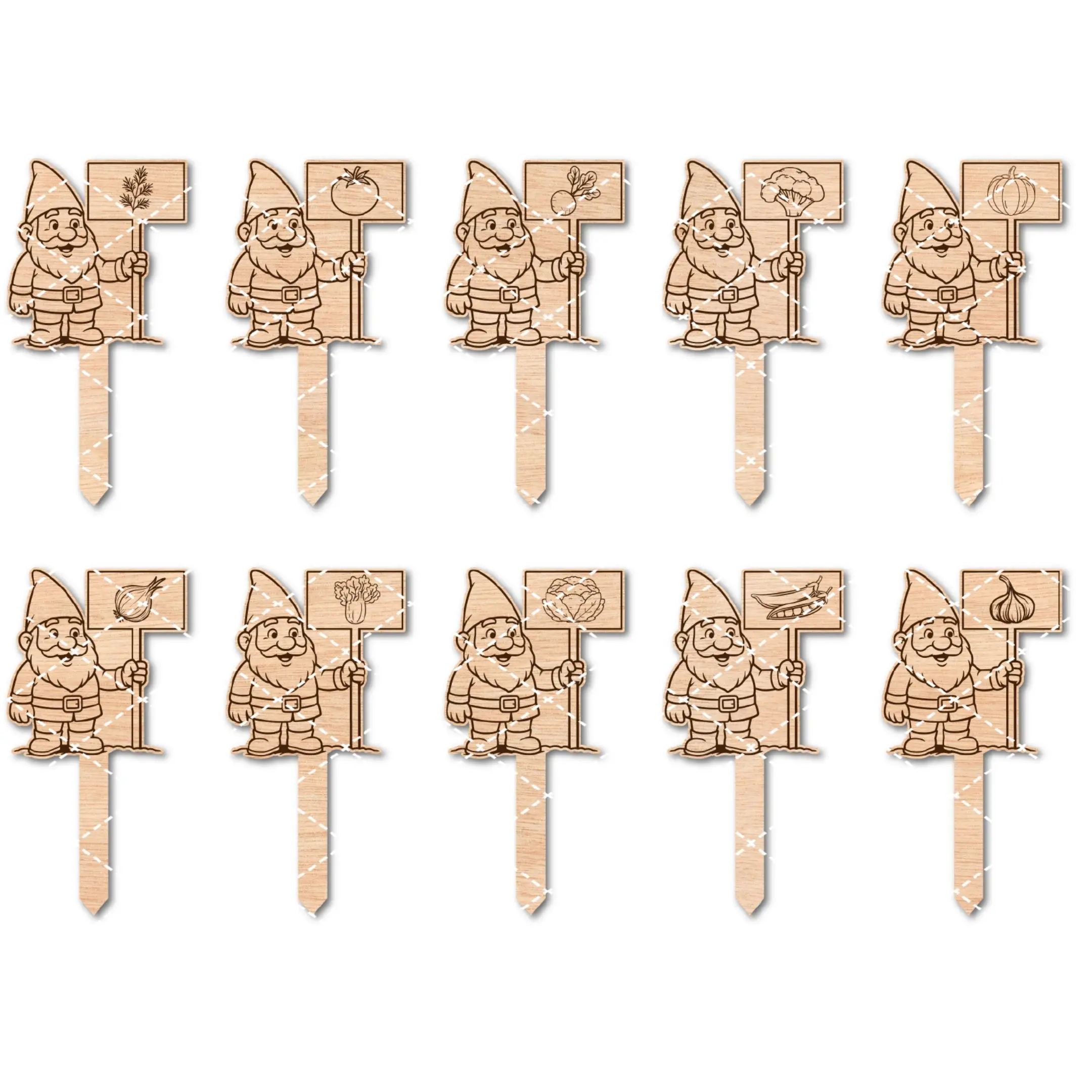 A set of 50 laser cut plant markers shaped like gnomes, each engraved with a vegetable symbol. A creative and practical way to label your garden plants.