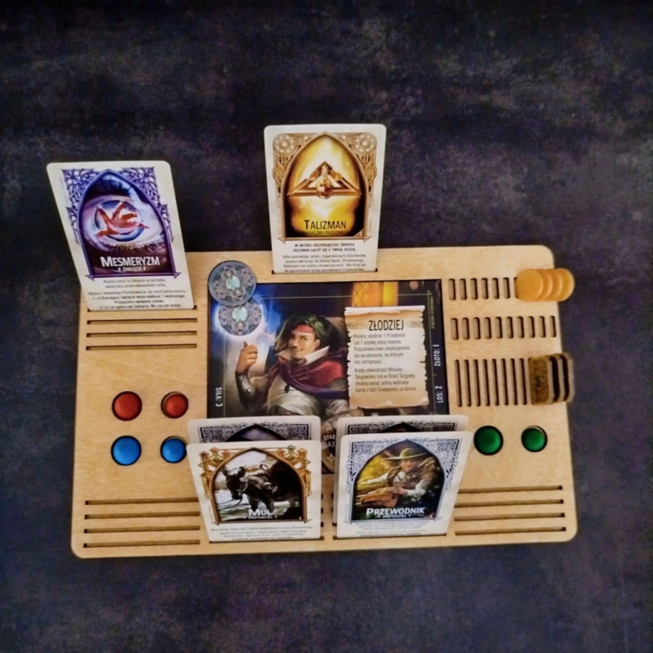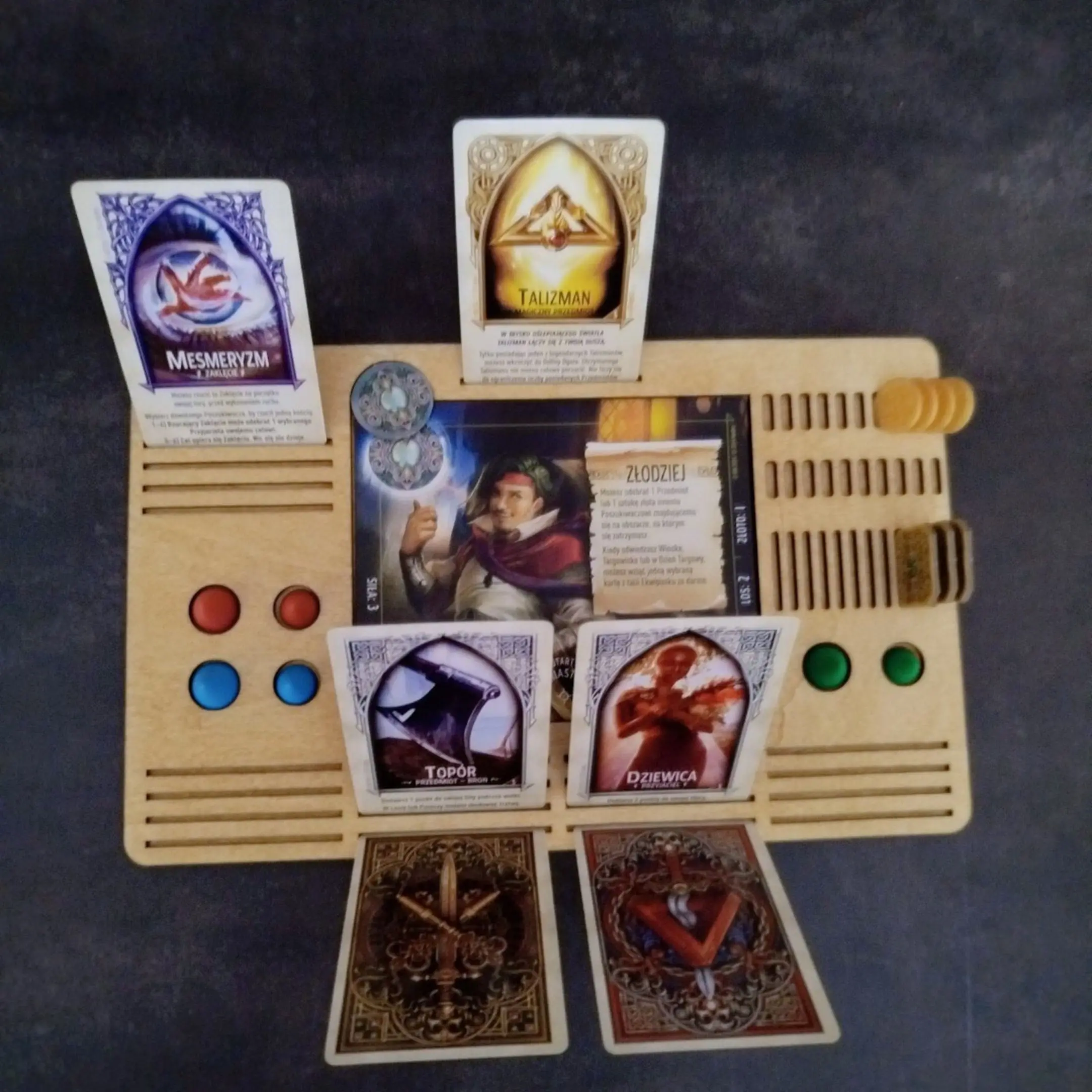 Laser cut player board for Talisman 5th Edition, designed to keep all components organized during gameplay. Features dedicated slots for spell, item, and friend cards, a special slot for the Talisman card, counter slots for tracking stats, and space for coins and fate tokens. Perfect accessory to enhance your Talisman experience.
