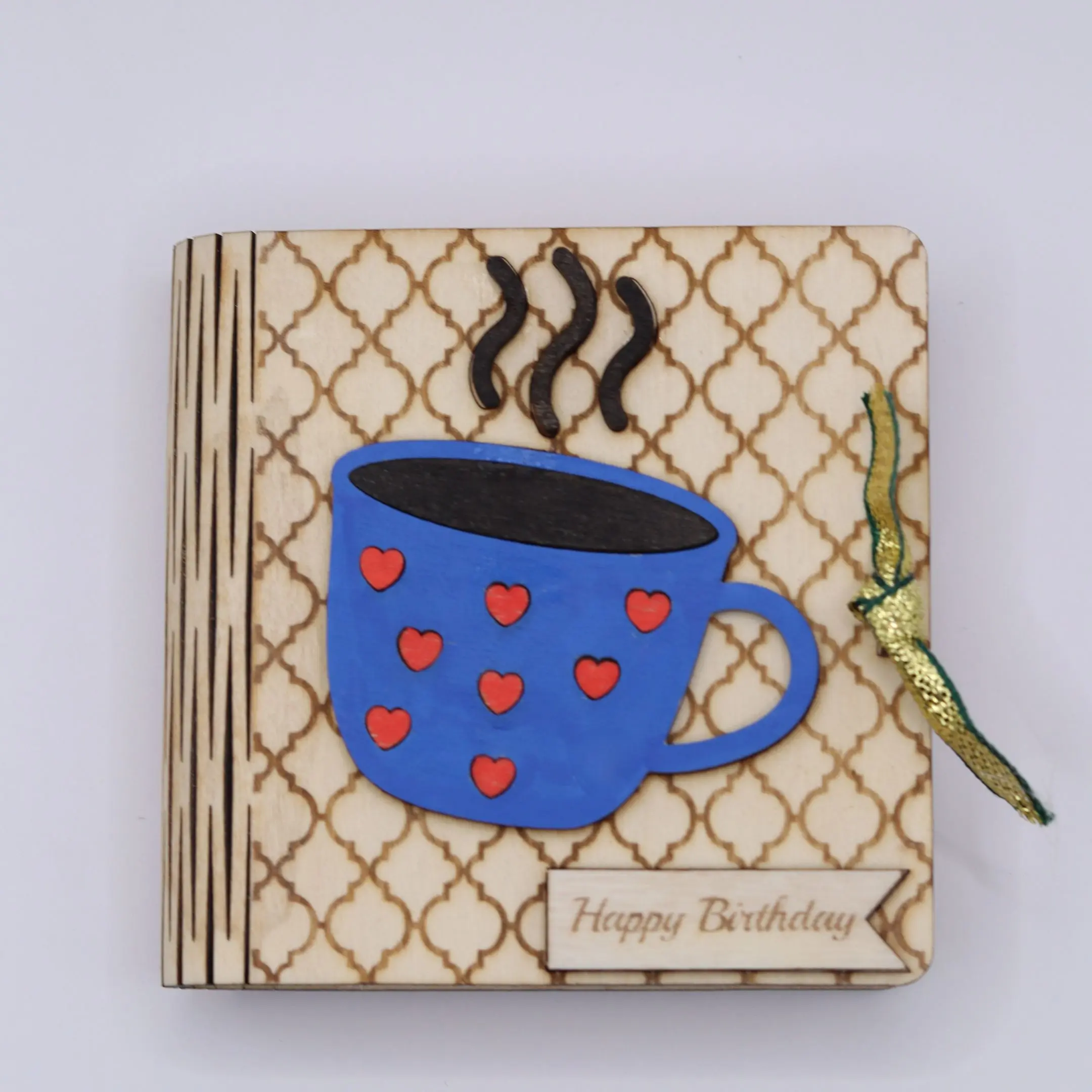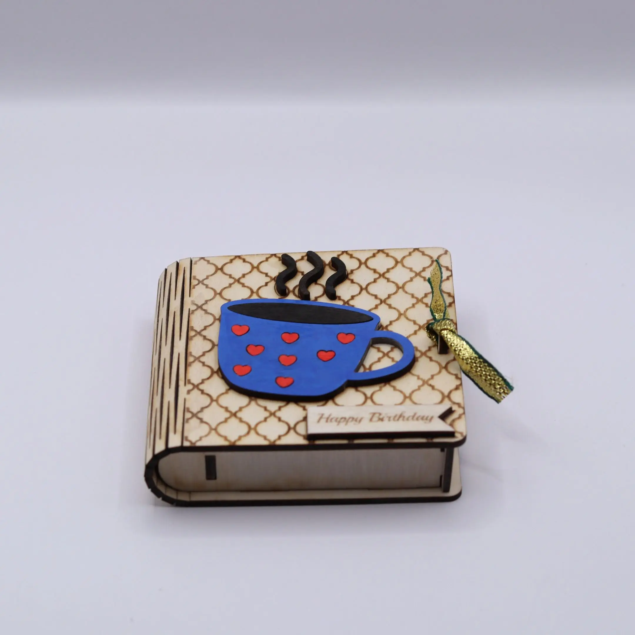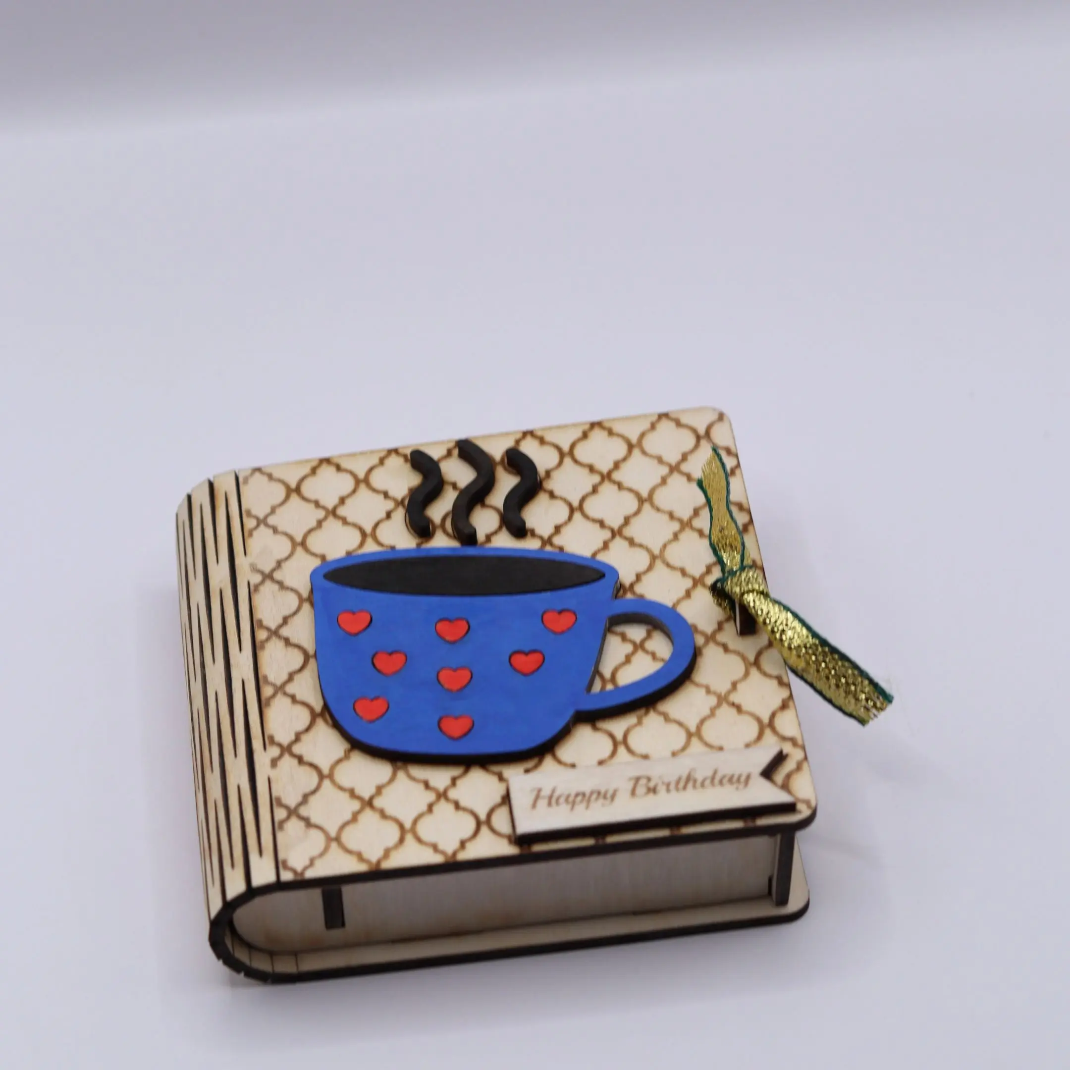Laser cut gift box for coffee or tea sachets, perfect for special occasions. Features 6 unique designs and space for a short personalized message, such as ‘Happy Birthday.’ The box closes elegantly with a string or ribbon and can hold approximately 5–6 tea bags, depending on their thickness. A charming and practical way to present a thoughtful gift.