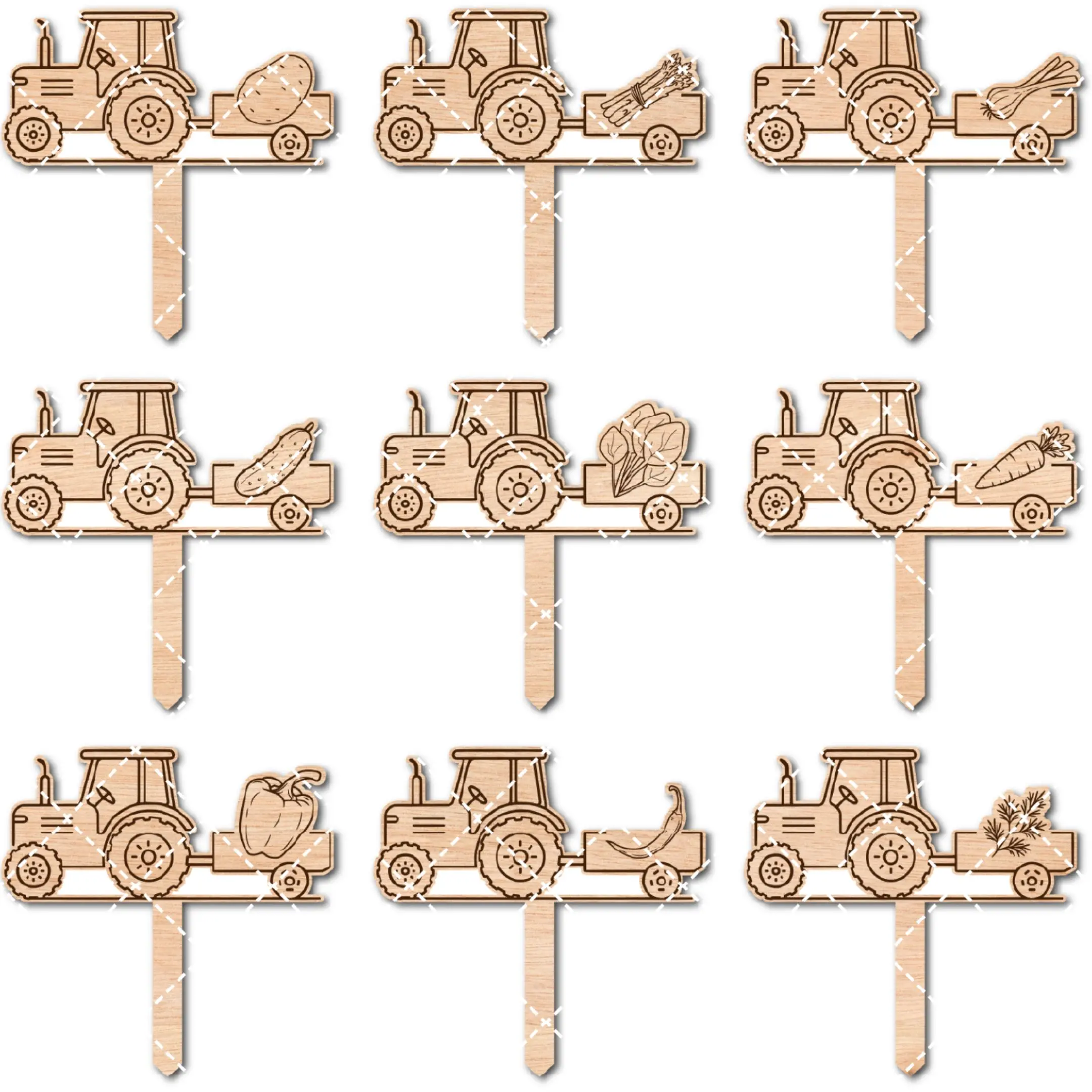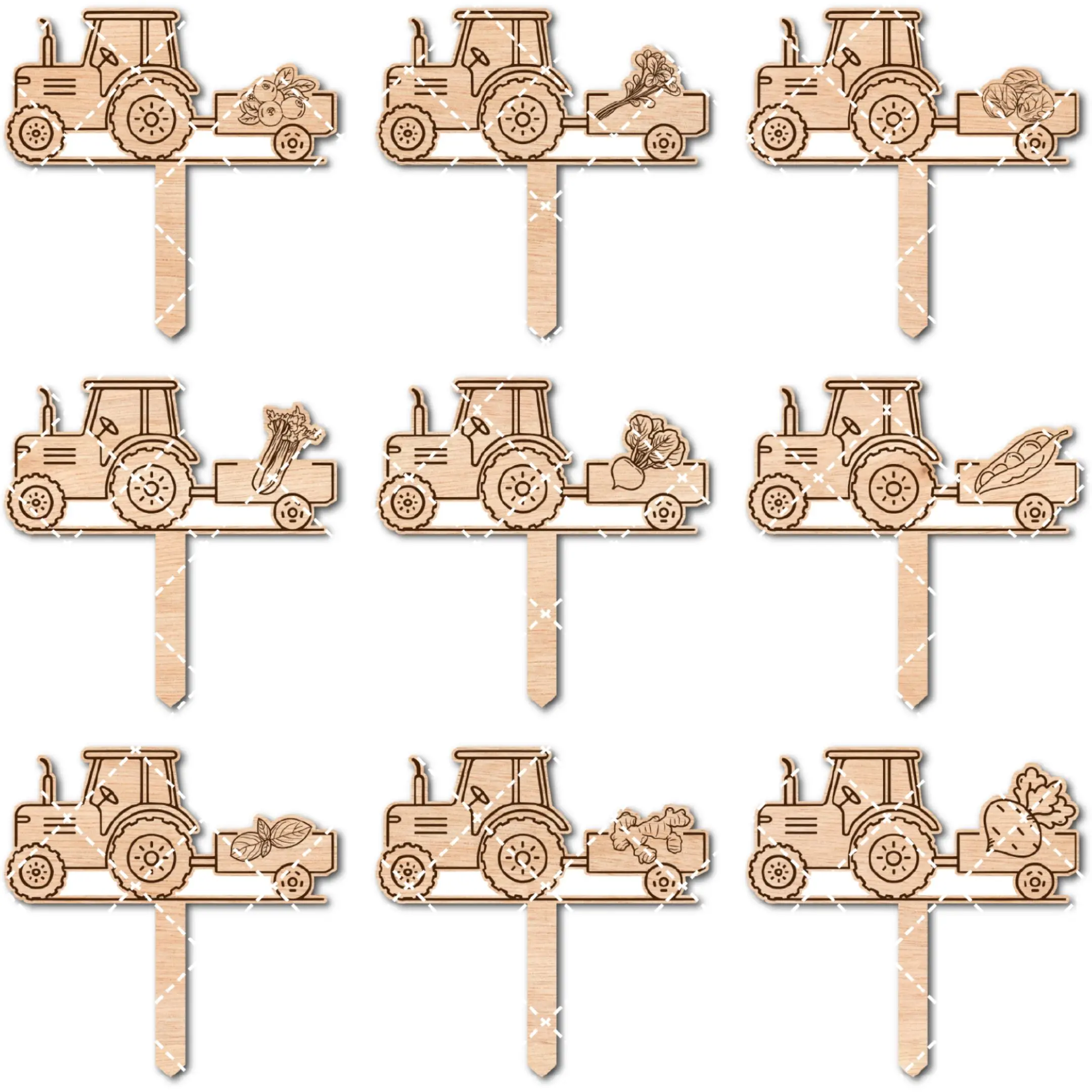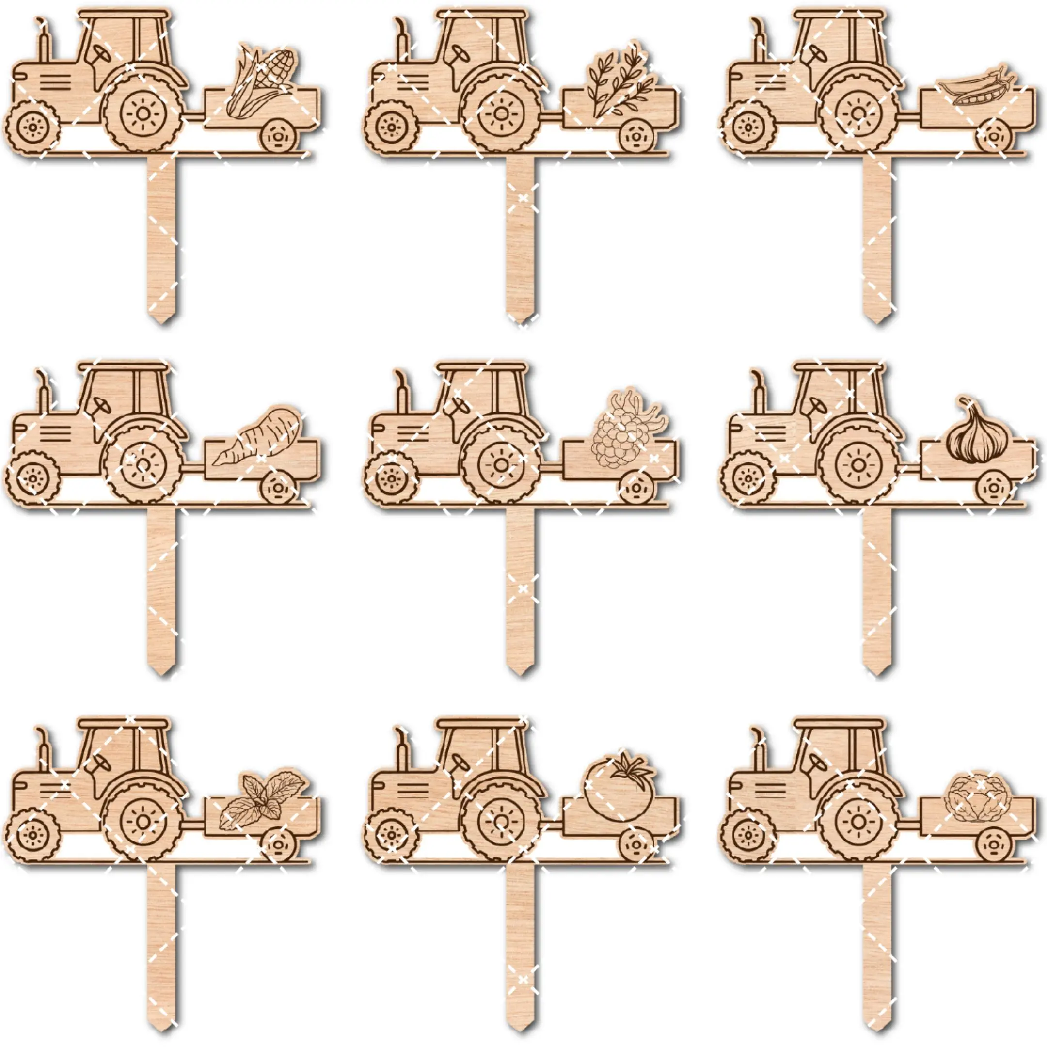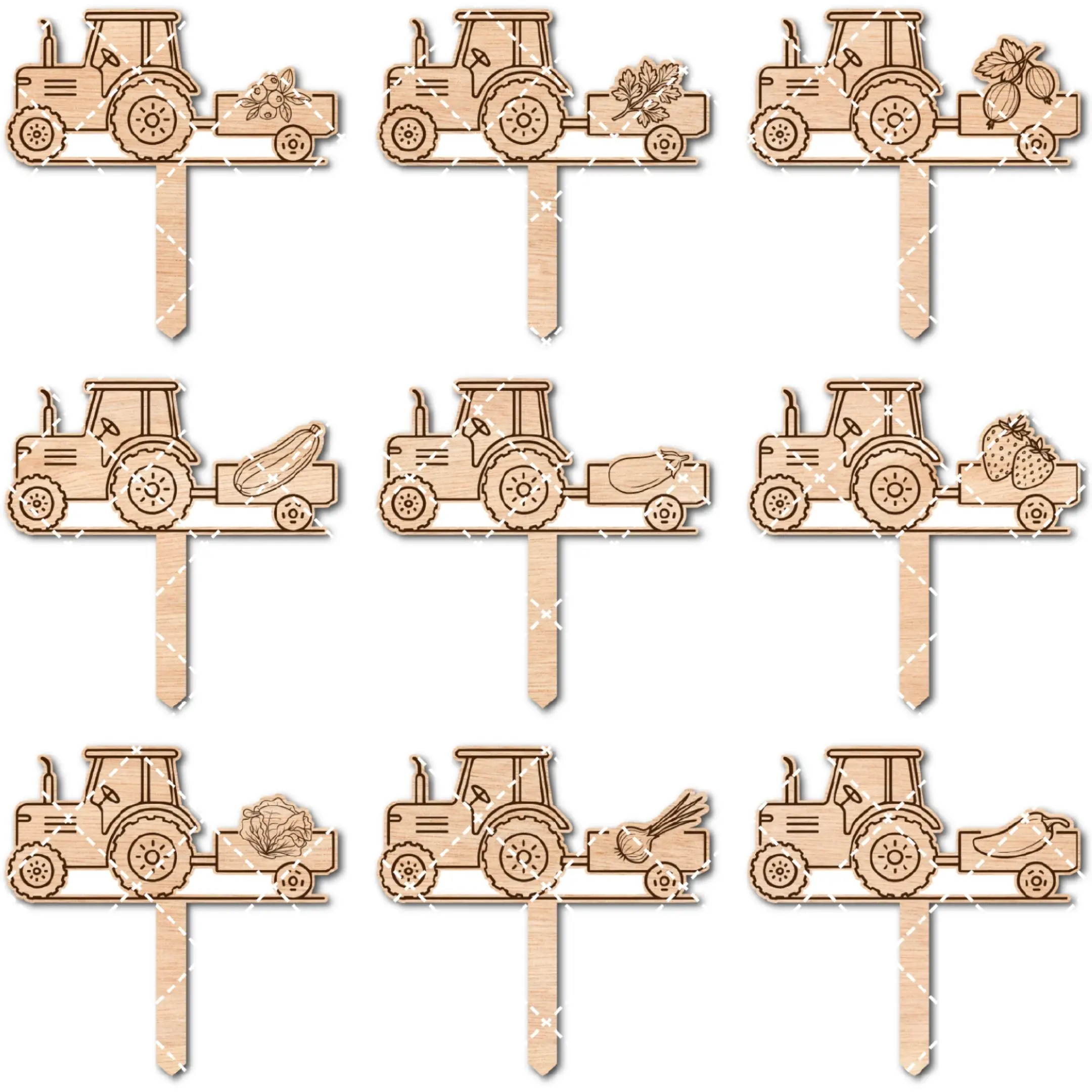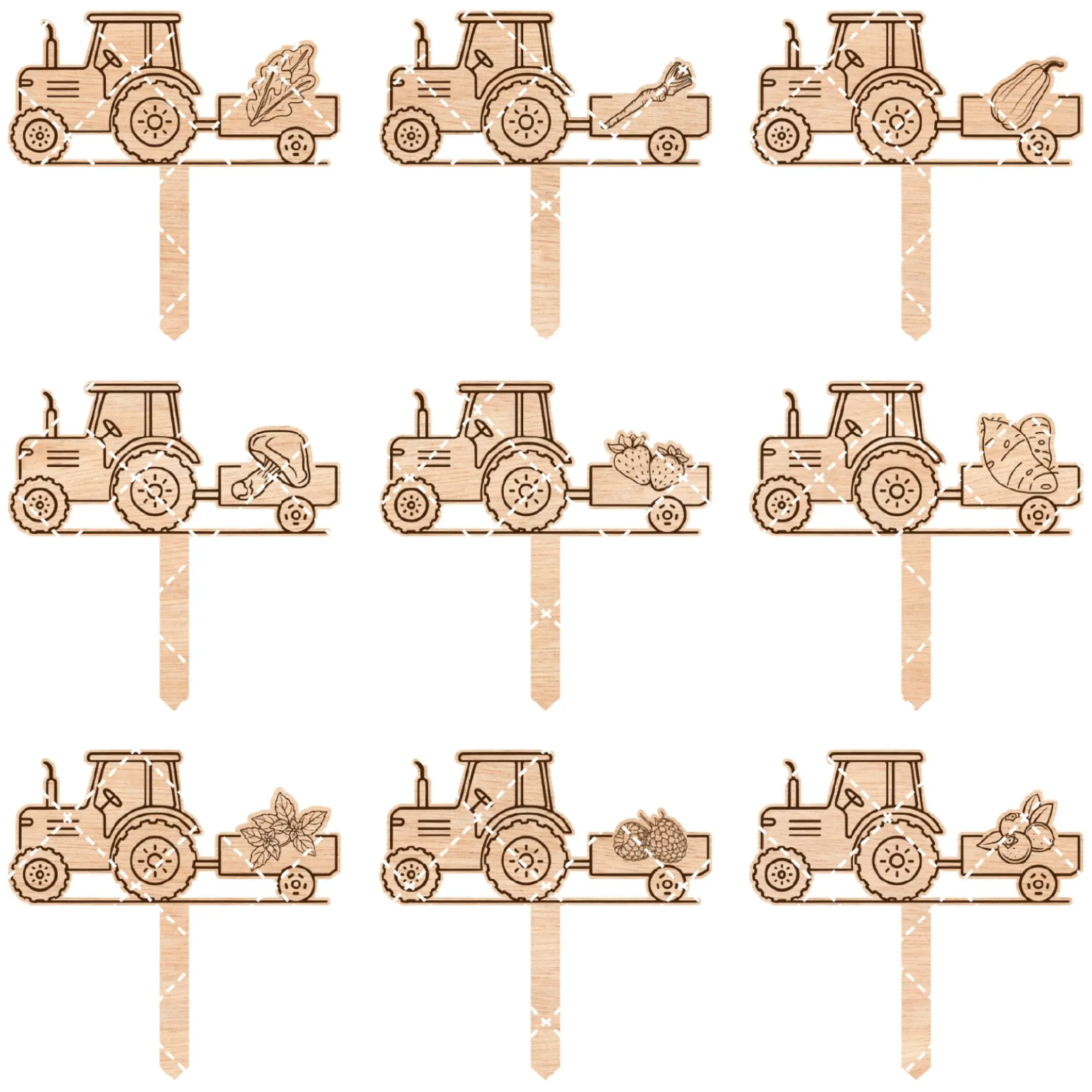 A set of 50 laser cut plant markers shaped like tractors, each engraved with a vegetable symbol. A creative and practical way to label your garden plants.